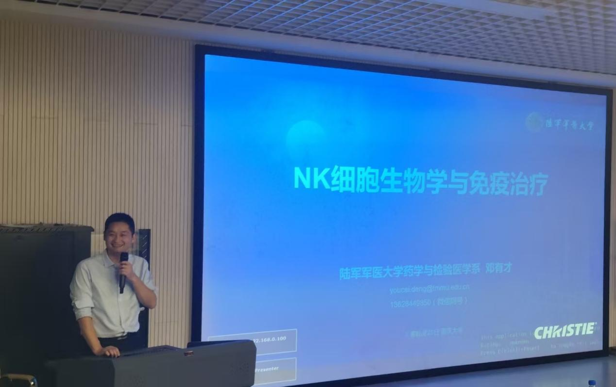 金晓清对邓有才教授的到来表示热烈欢迎,并对报告人作了介绍:邓有才教授是陆军军医大学临床血液学教研室主任、教授、博士生导师,国家优青、科技部重点研发计划首席科学家(青年)。他长期聚焦 NK 细胞生物学与免疫治疗基础与转化研究,主持多项国家级课题,以第一或通讯作者发表 SCI 论文 43 篇,总被引用 3100 余次,相关成果在 Immunity、Nat Commun 等顶级期刊发表,同时,邓有才教授还担任创伤与化学中毒全国重点实验室固定 PI、西南医院双聘 PI,以及中国药理学会抗炎免疫药理专委会常务委员兼副秘书长、青委主委,中国免疫学会全国理事,重庆市免疫学会常务理事兼秘书长,国家自然科学基金会评专家等多项重要学术职务。